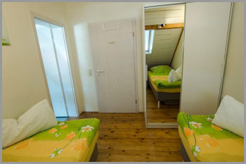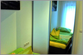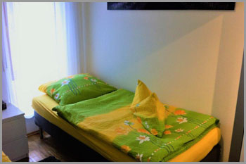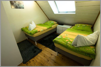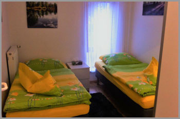 2 Einzelbetten (90 x 200 cm) können zum Doppelbett zusammengestellt werden, 2 Nachttische, Radiowecker, Leselampe