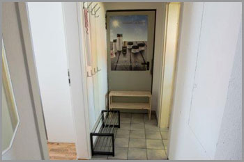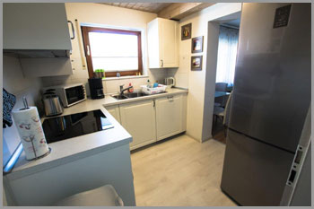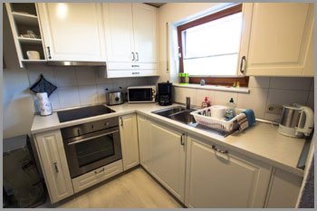 Eingang Küche mit Gefrierkombination, Mikrowelle, Wasserkocher, Kaffeemaschine, Handseife, Geschirrtücher
